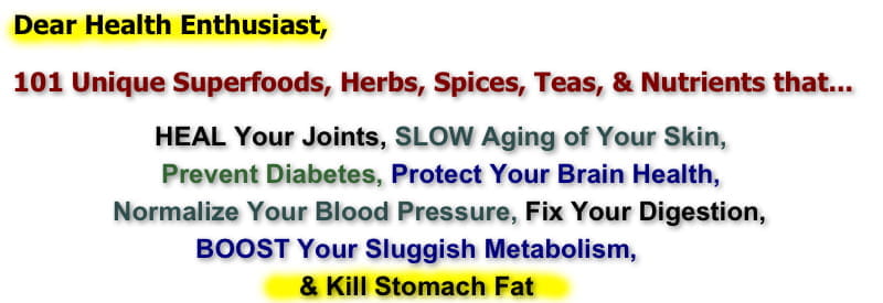 Exciting Metabolic Side Effect: Many of the anti-aging superfoods, teas, spices, herbs, secret supplements, and ingredients you'll discover in this manual will also help to BOOST your metabolism and increase fat-burning inside your body. This is a natural side effect you'll experience from some of the powerful phytochemicals and other nutrients you'll find inside! This occurs due to the robust effects these nutrients have in your body such as: